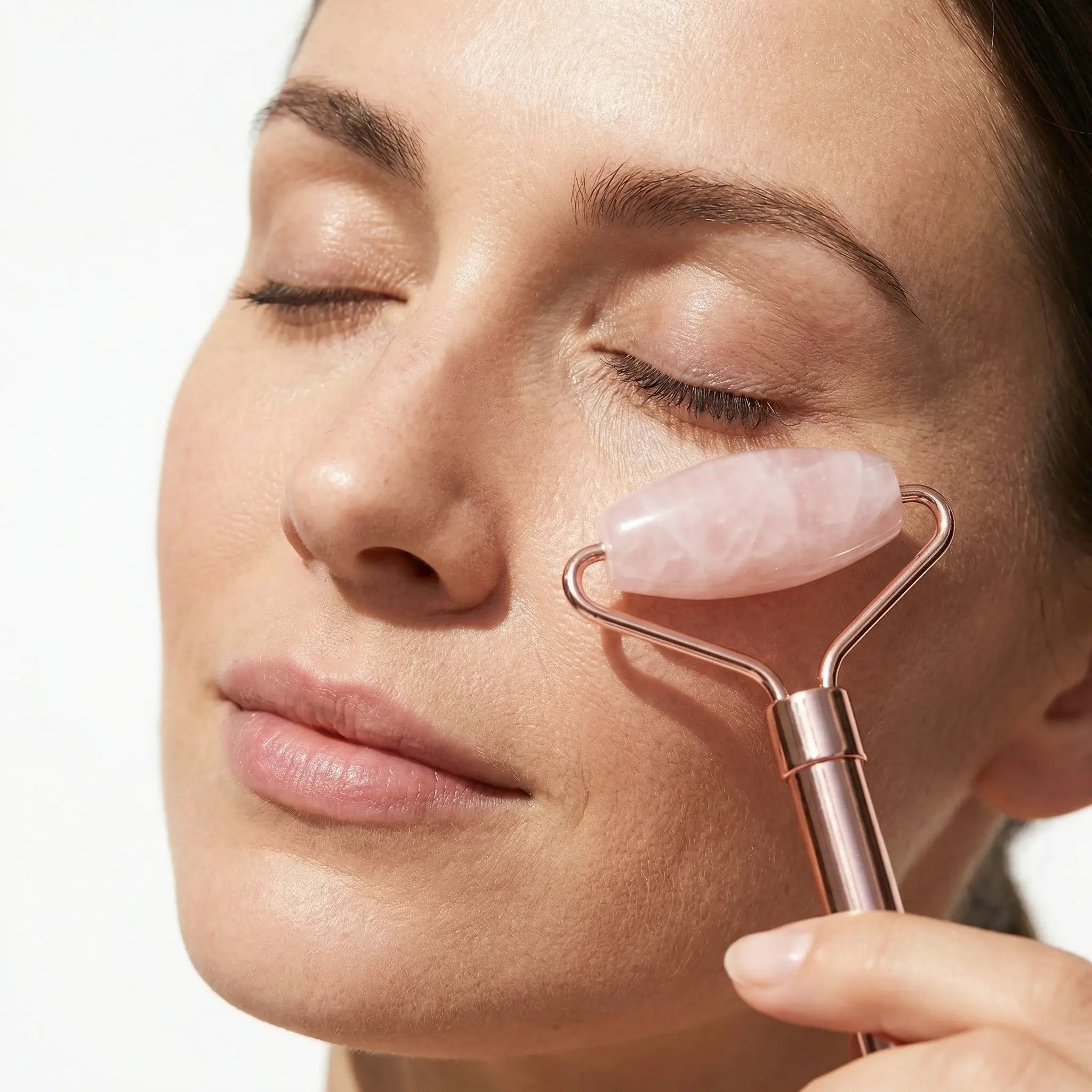 We don't use glass or resin. Each tool is hand-carved from Grade A Brazilian Rose Quartz—the stone of self-love. It features a solid Rose Gold Zinc Alloy frame with eco-friendly electroplating that is rust-resistant and safe for sensitive skin. No squeaking, just smooth, silent rolling.