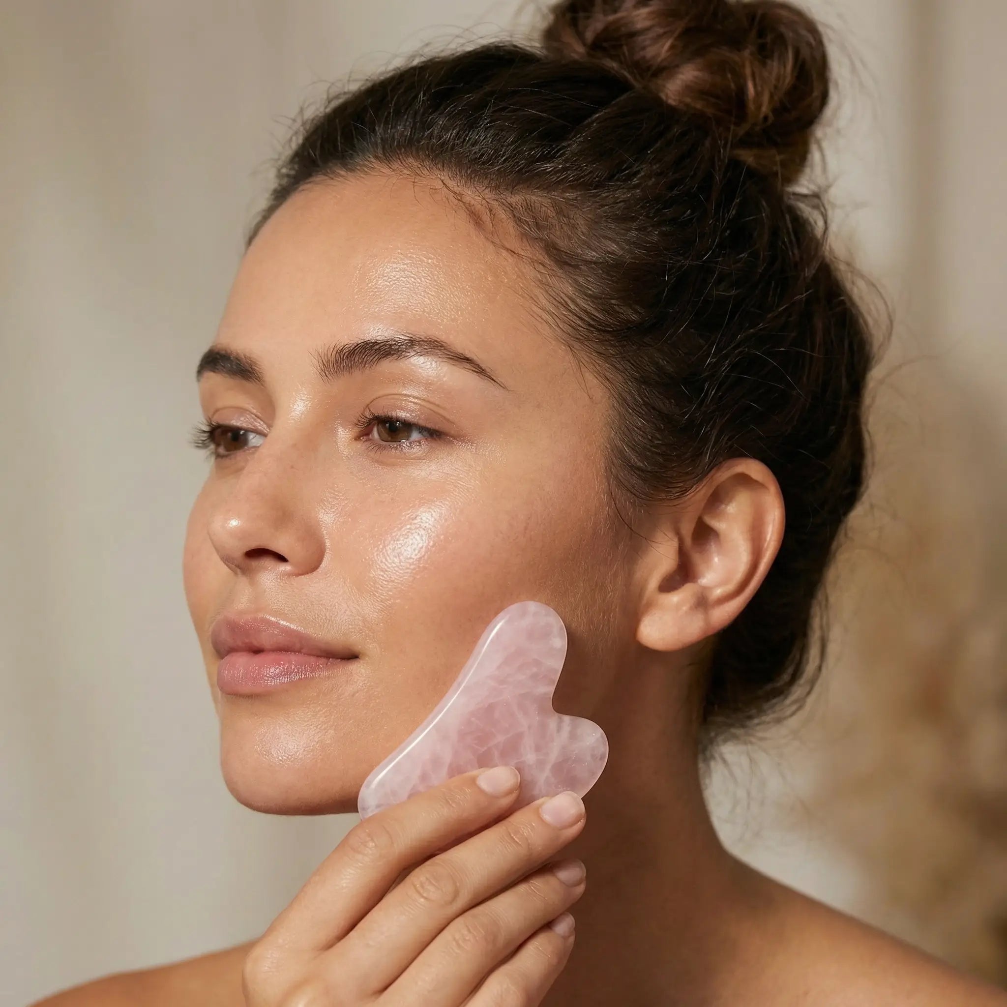 - Sculpt: Use the Gua Sha at a 45-degree angle. Glide up the jawline, under the cheekbones, and across the brow bone. Repeat each stroke 3-5 times.